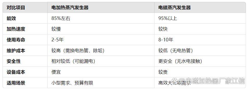 如果短期成本敏感,且用量不大,電加熱蒸汽發生器性價比較高;如果長期使用,且要求節能高效,電磁蒸汽發生器更值得投資。 |