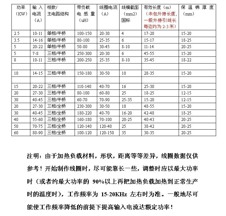 要知道電磁加熱線圈如何制作,首先要了解線圈的兩個重要參數:即橫截面積和電感量。 橫截面積是決定電流多少。功率越大橫截面積就越大,反之就越小。一般地,同臺機器,電感量越低工作頻率也就越高。功率也就會獲得越高。反之就會越低。 廣東江信電子電磁加熱產品2-60KW選擇線圈參數表如下: