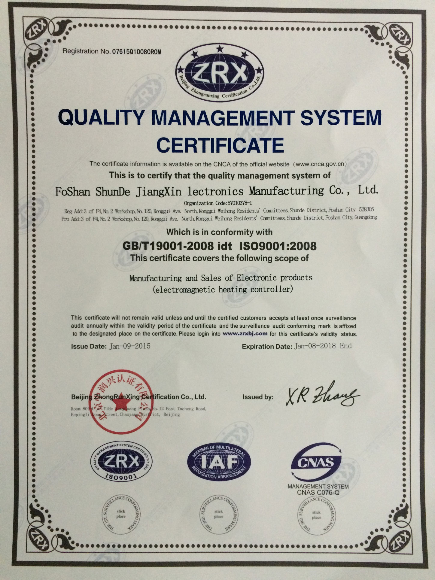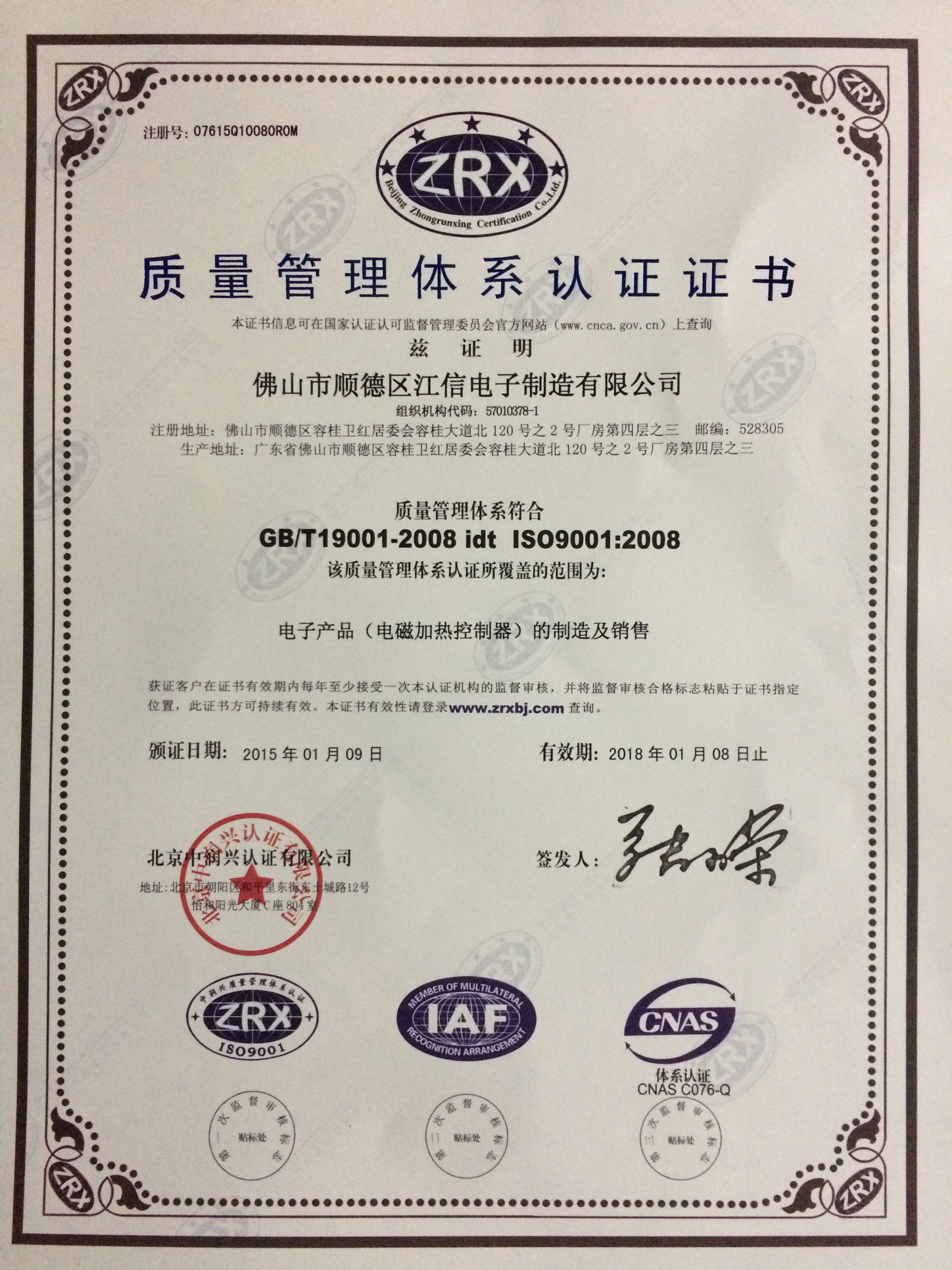 ??? 江信電磁通過了國家ISO9001質量認證,再次證明了江信電磁的實力雄厚,產品質量過硬,企業管理水平高,獲得了國際貿易的“通行證”,消除了國際貿易壁壘,值得廣大客戶的信賴,是中國電磁加熱行業具影響力的品牌。然而,江信電磁不會停止前進的腳步,它會一如既往地努力,追求更加完美、更加節能、更加環保的電磁加熱產品,為世界的節能減排貢獻力量!