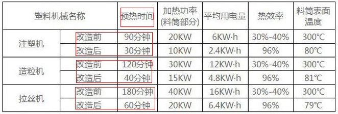 ? ?注塑機、造粒機、拉絲機、經電磁加熱改造后,對比于電阻絲加熱方式,采用電磁加熱改造后,不僅能節能30%—70%,而且一般還能夠提高2/3的預熱時間,具體請看如下表: