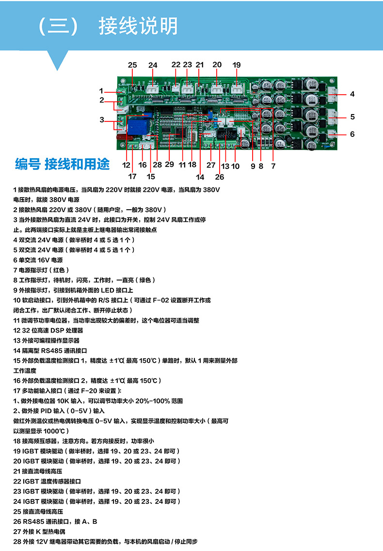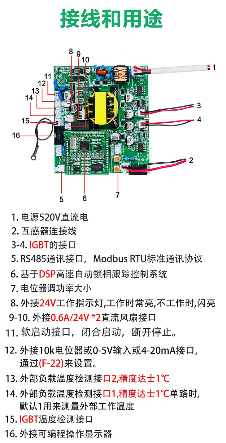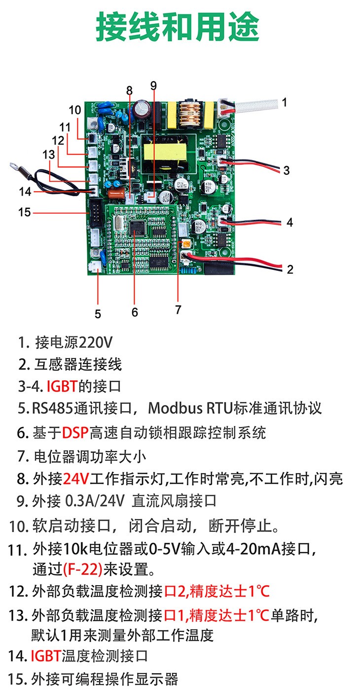單相半橋1KW~10KW或三相全橋/半橋5KW~30KW電磁加熱驅動板,能應用于簡單的電磁加熱系統之中,也可配套自動化系統,并預留工業485總線與計算機鏈接通訊接口,滿足自動化控制中的接口需求。對于單相可應用于1~10KW電磁加熱驅動,最大可驅動150A/1200V IGBT。對于三相可應用于5~30KW全橋/半橋電磁加熱驅動,最大可驅動450A/1200V IGBT.集成了全數字核心控制器和IGBT驅動器,外部只加IGBT模塊、整流橋堆、諧振電容、散熱器等器件就可以組裝成高性能電磁感應加熱系統